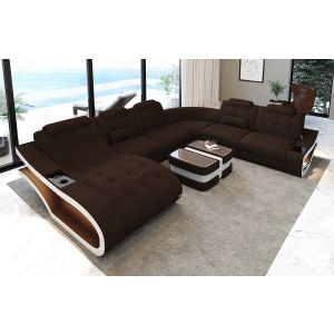 Das Ecksofa Elegante Stoff präsentiert sich in elegant geformter L‑Form, die moderner Designerästhetik und durchdachte Funktionalität vereint. Die ergonomisch geformte Ottomane und die großzügig bemessenen Sitzflächen bieten viel Raum für entspanntes Sitzen, Lesen oder geselliges Beisammensein. Die klaren Linien und die sorgfältige Verarbeitung schaffen ein visuelles Highlight, das mit hochwertiger Erscheinung sofort ins Auge fällt. Besonders markant: die fließend geschwungenen Seitenteile, die sich harmonisch in das Gesamtbild einfügen und mit integriertem LED-Licht sanfte Akzente setzen.