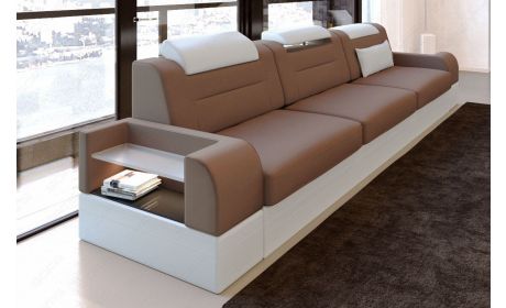 Bei dieser Ausführung wird das Sofa vollständig mit echtem italienischem Nappaleder bezogen. Es handelt es sich hierbei um ein hochwertiges Rindsleder aus Italien mit feiner Narbung und exzellenten Eigenschaften. Es ist besonders weich und nur mit einer leichten Pigmentierung versehen, um die Oberfläche gegen das Eindringen von Flüssigkeit und gegen Verschmutzungen besser zu schützen. Die natürliche Narbung ist dennoch nahezu unverändert und gut sichtbar. Das Material besitzt beste Eigenschaften, Komfort, Design oder Materialstärke, die Ihre Polstermöbel zu einem Erlebnis werden lassen, an dem Sie sich dauerhaft erfreuen können. Diese Variante empfiehlt sich besonders in Fällen, wo das Sofa frei im Raum steht und von allen Seiten zugänglich und sichtbar ist.